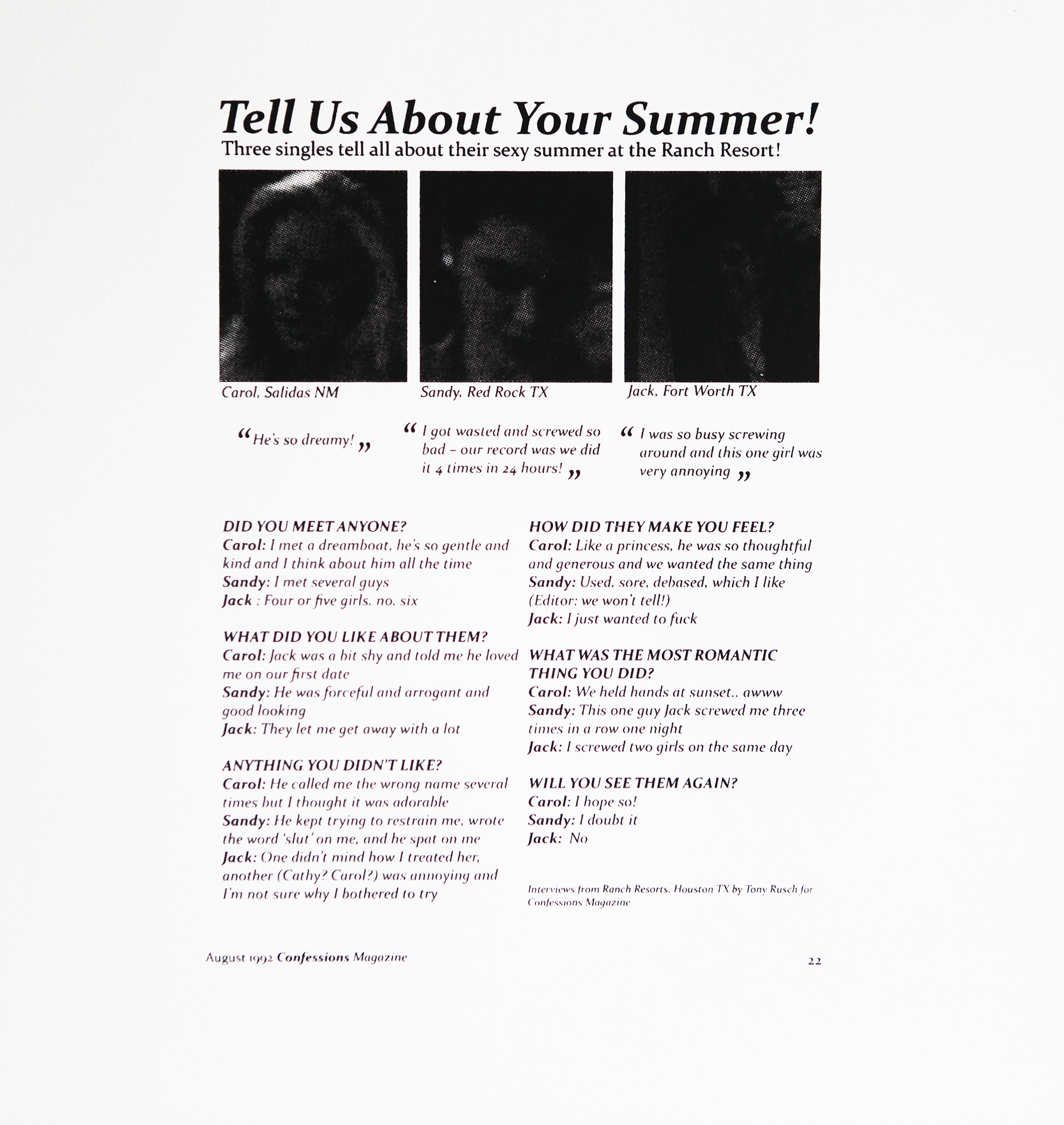 Confessions Magazine, August 1992. Reprint by Tony Rusch for Rusch Media. Black ink, silkscreen halftone on white 200gsm paper. Printed NY, October 2024.