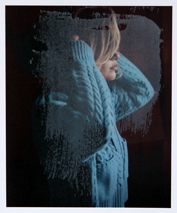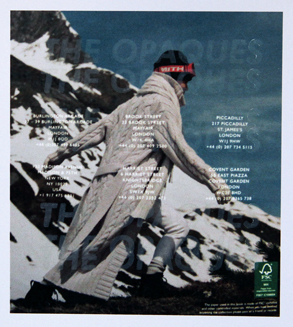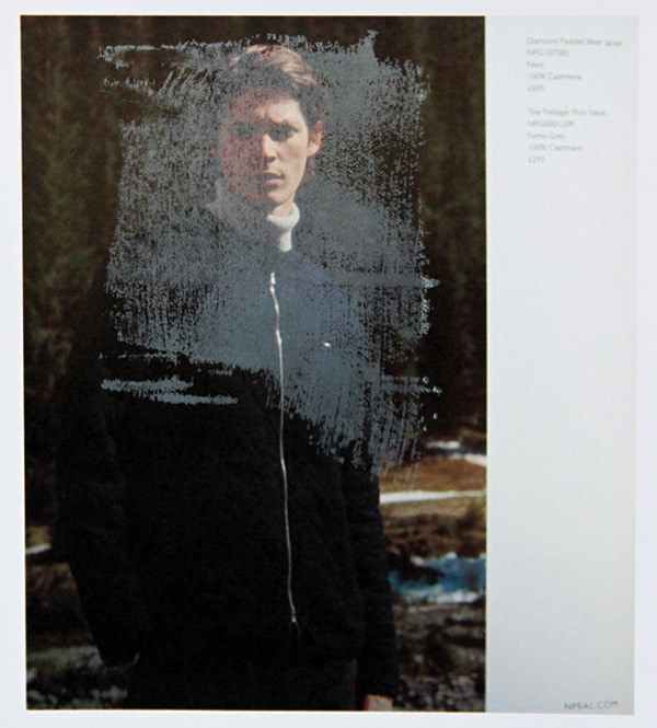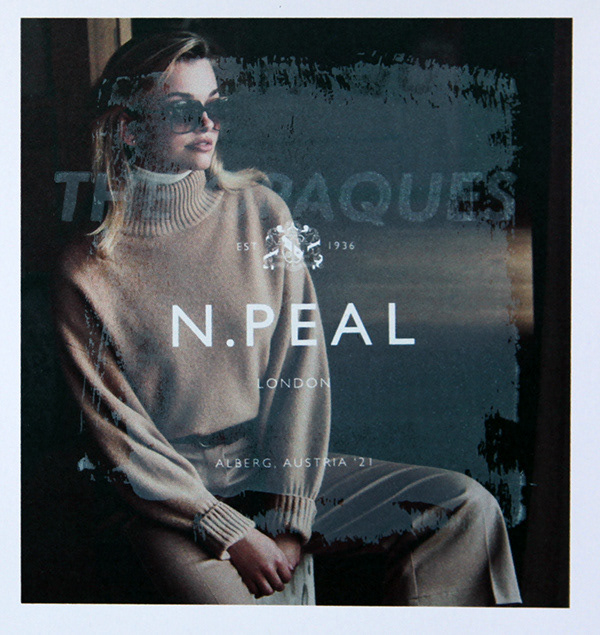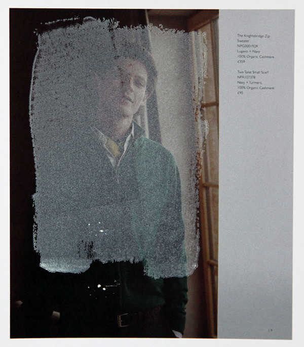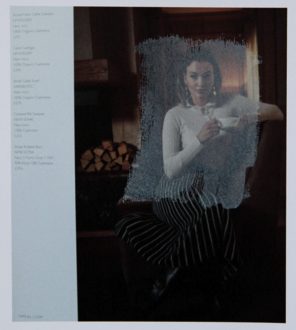 Re-photographed overprinted N.Peal AW/21 catalogue, digitally printed on gloss paper (Epson SP700). Letterpress halftones. Overprinted with white opaque ink. November 2021. London. Special thanks and apologies to N.Peal